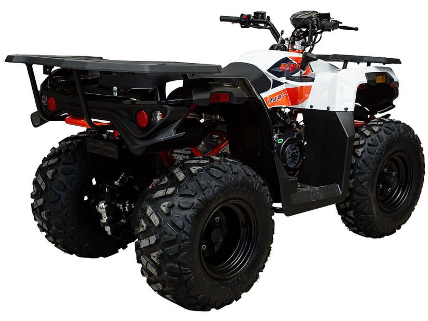 Квадрицикл KAYO AU180 – надёжный и доступный утилитарный квадроцикл с большими возможностями практического применения. Модель пользуется спросом среди широкого круга поклонников мототехники и любителей поездок по бездорожью, поскольку сочетает в себе тяговитый двигатель, энергоёмкую подвеску, отличную эргономику и агрессивный дизайн.Силовая установка представляет собой 4-тактный одноцилиндровый двигатель воздушного охлаждения объёмом 177 см3 (1P63QMK), который позволяет развивать максимальную мощность 10 л.с. Карбюраторная система подачи топлива обеспечивает бесперебойную работу техники в самых жёстких условиях эксплуатации, простоту и лёгкость в обслуживании, а также неприхотливость к качеству топлива. Для надёжной работы силового агрегата и исключения масляного голодания в нижней части картера двигателя установлен производительный масляный насос, что позволит эксплуатировать квадроцикл на склонах до 40˚ без негативных последствий для двигателя.Автоматическая трансмиссия вариаторного типа также снабжена реверсом, который особенно облегчает маневрирование в ограниченных пространствах. Привод на ведущие задние колёса осуществляется цепью. Рама квадрицикла выполнена из хром-молибденового сплава, поэтому она лёгкая, прочная и обеспечивает отличную жёсткость и защиту от повреждений. На квадрицикл установлены литые алюминиевые диски диаметром 10 дюймов, обутые в покрышки с ярко выраженным грунтозацепом (параметры шин: передняя – 10" AT23*7-10" задняя – 10" AT22*10-10").Ходовая часть квадрицикла базируется на передней независимой двухрычажной подвеске с шаровыми опорами и нерегулируемыми амортизаторами, сзади установлена маятниковая подвеска с моноамортизатором, жесткость преднатяга пружины которого можно отрегулировать. Эффективное замедление с любых скоростей обеспечивают гидравлические дисковые тормоза спереди и сзади. Аппарат обладает комплектом качественной светотехники, широкими защитными крыльями, передней и задней багажными площадками для перевозки небольших грузов, фаркопом для прицепа, а также эргономичным сиденьем и удобным рулевым управлением, что обеспечивает комфортную езду.