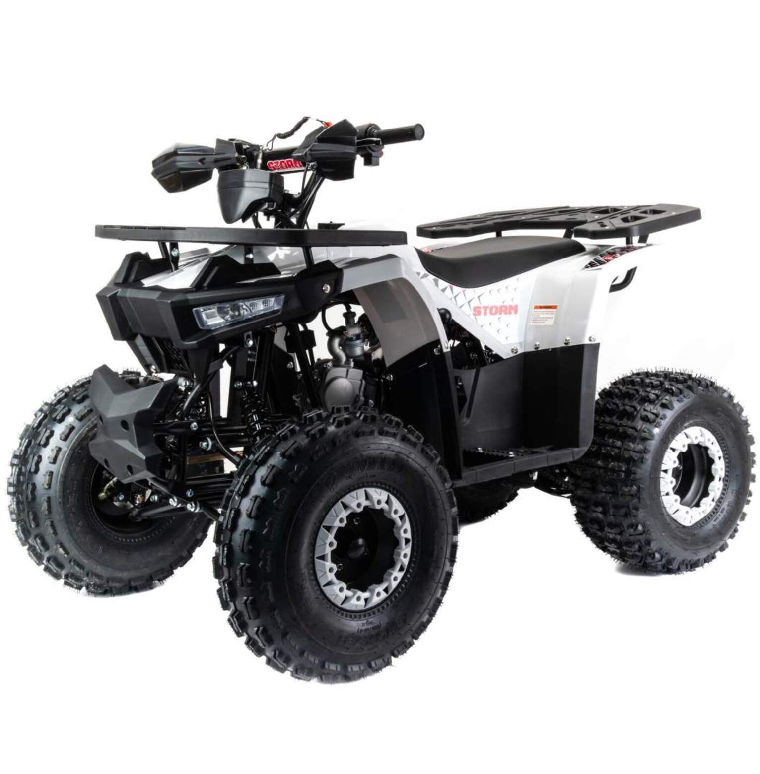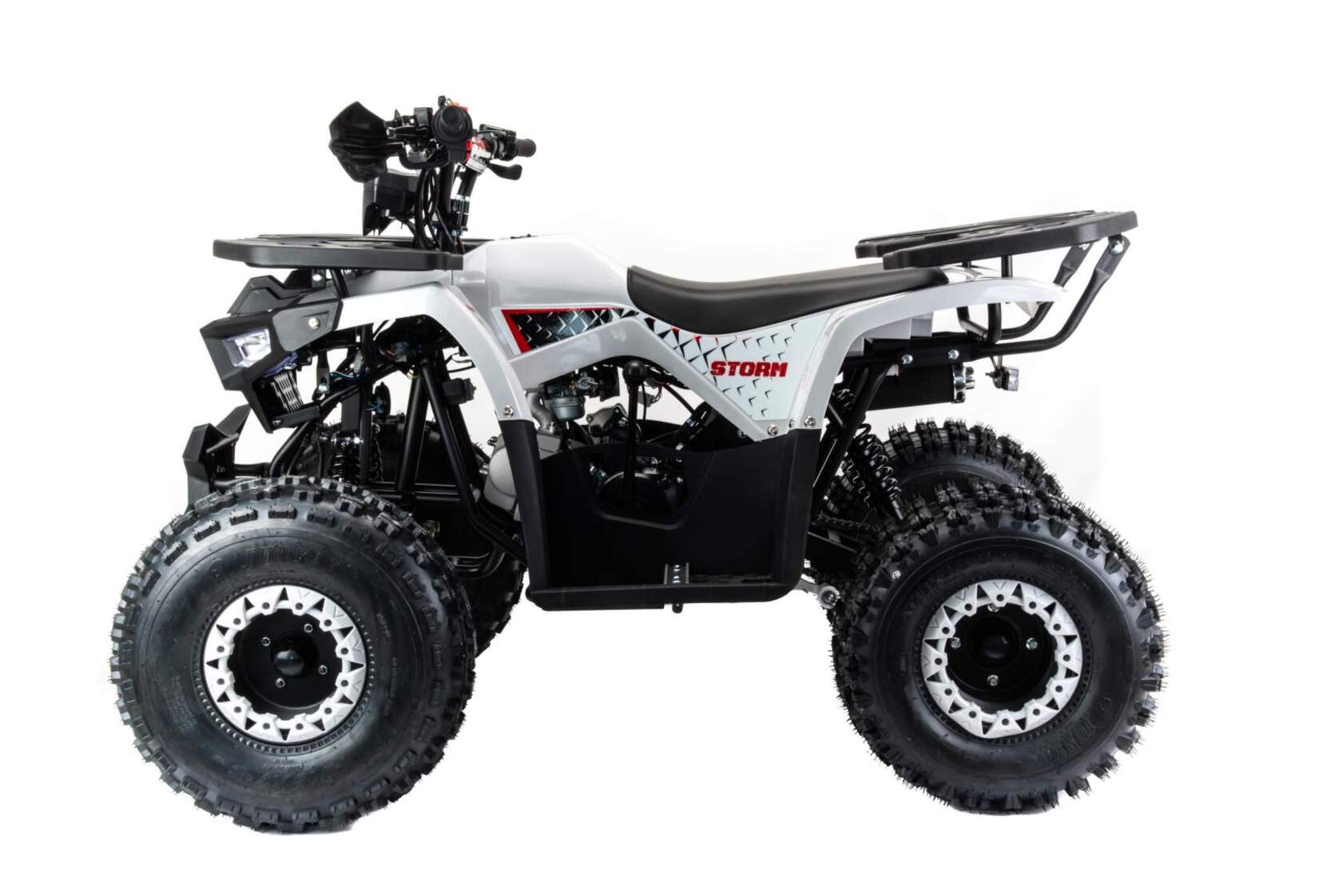 Квадроцикл Motoland (п) 125 STORM A - cтильный, современный, универсальный квадроцикл подойдет вашему ребенку как мальчику, так и девочке. Его утилитарный дизайн разработан с учетом вкусов современного поколения и понравится всем без исключения.Квадроцикл не предназначен для дорог общественного пользования. Его 8 дюймовые колеса на хорошей внедорожной резине с легкостью преодолеют все преграды в виде грязи, песка, луж и кочек. А что еще нужно для веселых покатушек в выходные дни?У этого квадроцикла отличная управляемость в любых условиях эксплуатации, благодаря грамотной настройке подвески. Данный квадроцикл оснащен автоматической коробкой передач с реверсом, который установлен на усиленной раме, что дает уверенность в прочности конструкции.Ваш ребенок быстро овладеет навыками езды на данной технике и получит массу запоминающихся эмоций.Квадроцикл оснащен двигателем 1P54FMI 125 см3, мощностью 8 л.с. c воздушным охлаждением, электрстартером, LCD (электронная) панелью приборов, светодиодной оптикой, стоп-сигналомДля безопасности имеется чека отключения двигателя, если ребенок отпускает руль, то мотоцикл практически сразу отключается при разрыве чеки.Максимальная скорость 60 км/ч. Объем топливного бака составляет 3,5 л
