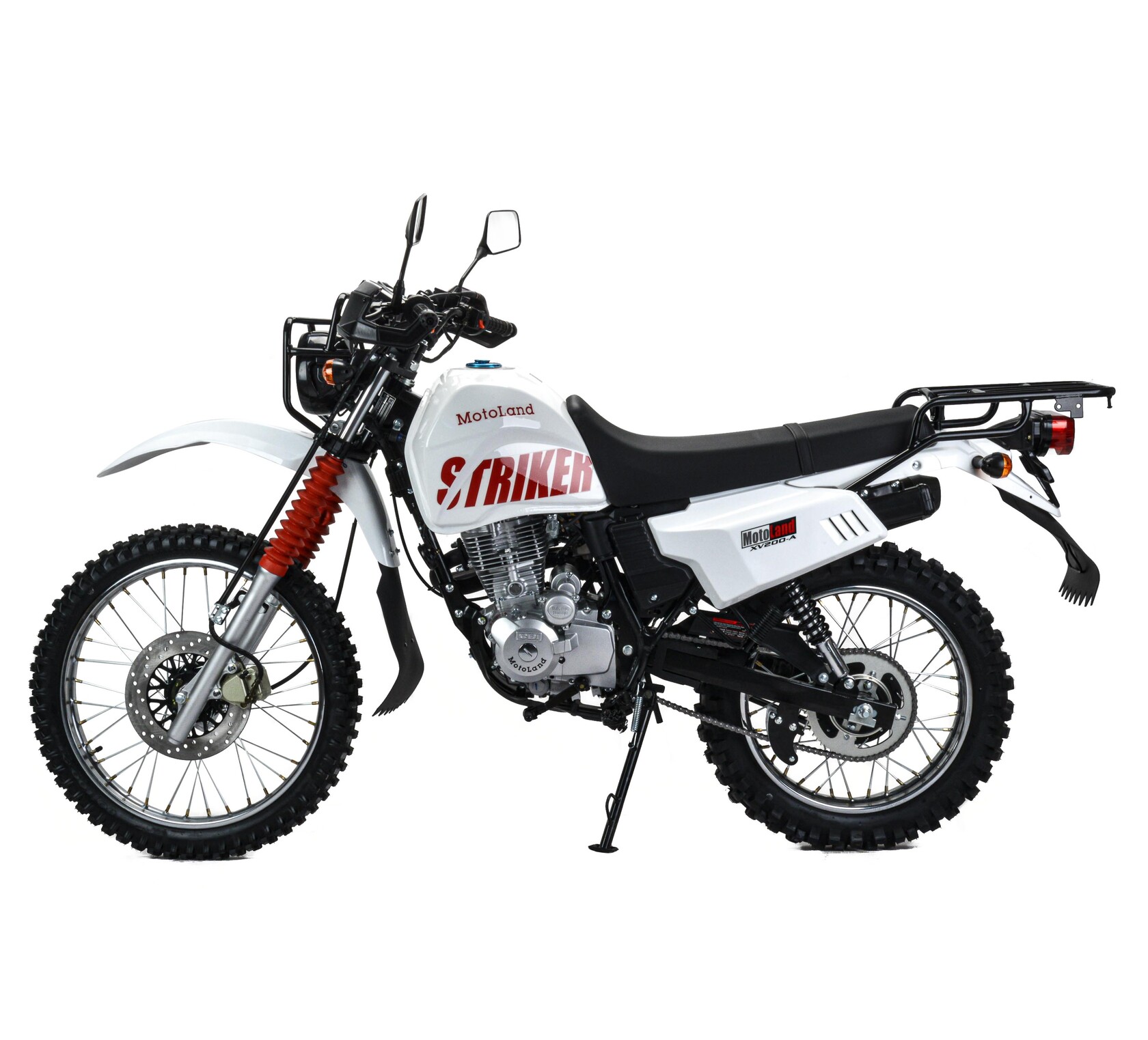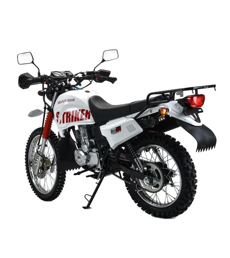 Motoland 200 STRIKER – новинка сезона 2024года в классическом. функциональным дизайном. Оснащён фарой дальнего и ближнего света, светоотражателями, большим стоп-сигналом.Это настоящая рабочая лошадка с хорошим запасом прочности для тяжёлой каждодневной работы. Покрышки с крупными шипами позволяют преодолевать препятствия, уверенно ездить по бездорожью.Большой металлический бак даёт возможность ездить на большие расстояния, не беспокоясь о наличии заправок. Мотоцикл оснащён механическим спидометром и тахометром. Передний тормоз дисковый, задний барабанный, легко регулируются, при необходимости их можно подтянуть даже в полевых условиях.Задняя подвеска включает 2 надёжных амортизатора. Руль обычного сечения с низким подъёмом оборудован защитой рук и специальной металлической дугой от повреждений при падении мотоцикла. Мотоцикл оборудован большим багажником.