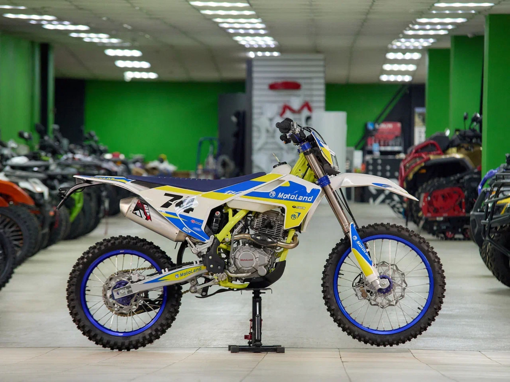 MotoLand TT 250 Новинка весны 2020 года. Теперь с ПТС.Надёжная техника из самых популярных компонентов оснащена Двигателем ZONGSHEN 172FMM с кикстартером и электростартером Мощностью 21 Л.С. на двигателе установлен Карбюратор NIBBI PE28.Это полноразмерный кроссовый мотоцикл его база по осям составляет 1430 мм., и габаритами 2180х800х1300 мм. Высота по седлу составляет 950 мм., что по сравнению с Моделью XT 250 ST 21/19 ниже порядка 20 мм. Что позволяет комфортно себя чувствовать райдерам среднего роста.За счет сбалансированной базы мотоцикл имеет отличную управляемость, а конструкция рамы и особенности настройки подвески GPX способствуют максимальному поглощению неровностей дорожного покрытия, а так же усиленная прогрессия на игольчатых подшипниках.Алюминиевые обода c антибуксаторами, усиленными спицами и ступицами CNC. На кроссовой резине Yuanxing 80/100-21 / 100/90-18На мотоцикле установлена обновлённая тормозная система аналог «brembo» с медными колодками , что обеспечивает отличные тормозные характеристики. Особенностью заднего тормоза является, лапка верхнего расположения с эксцентриковой регулировкой.Выпускной патрубок с резонатором Power Bomb имеет крепления на пружинах для снижения вибрации. Глушитель с уникальным дизайном прямоточного типа, полностью алюминиевый для облегчения веса.