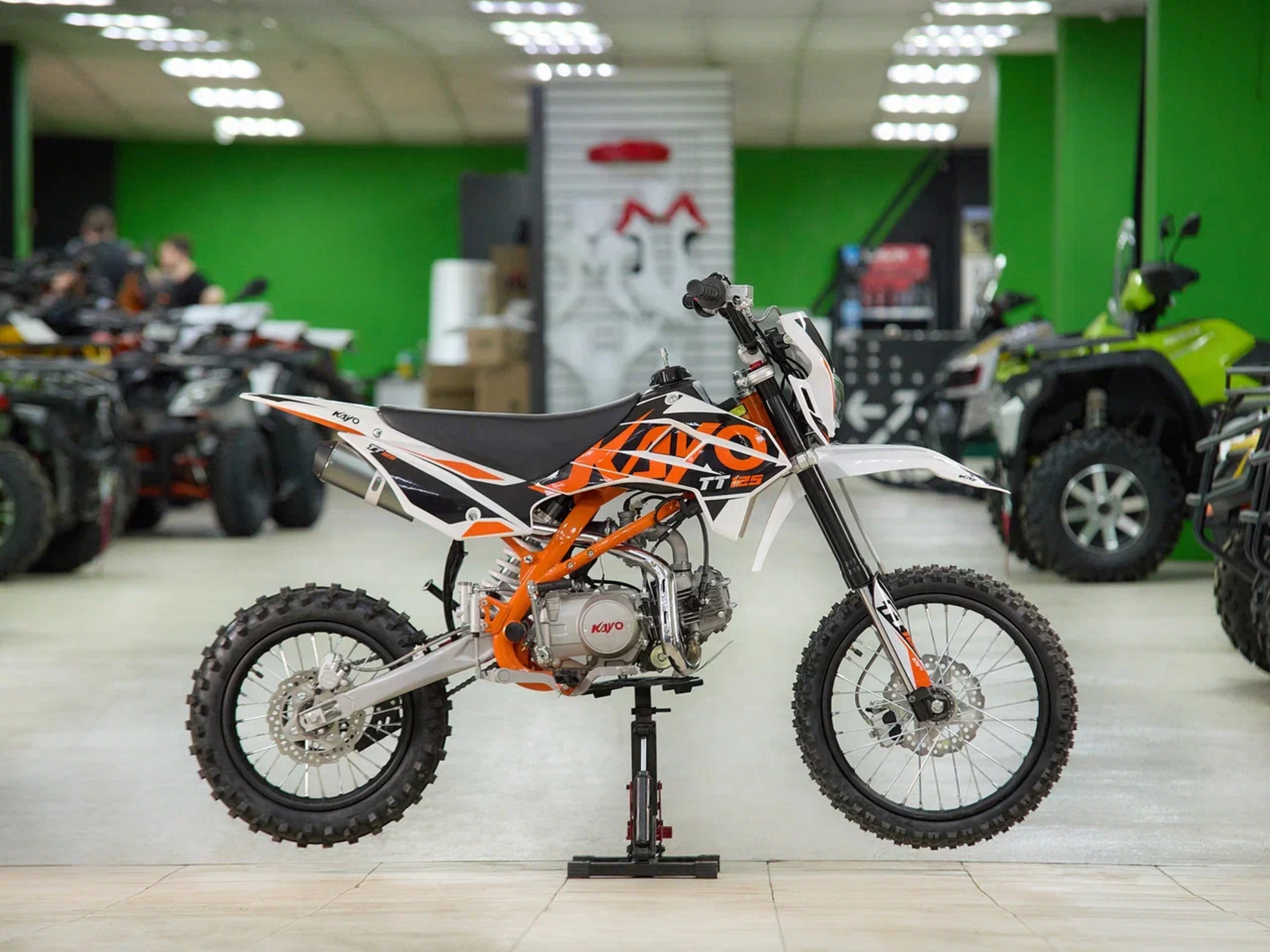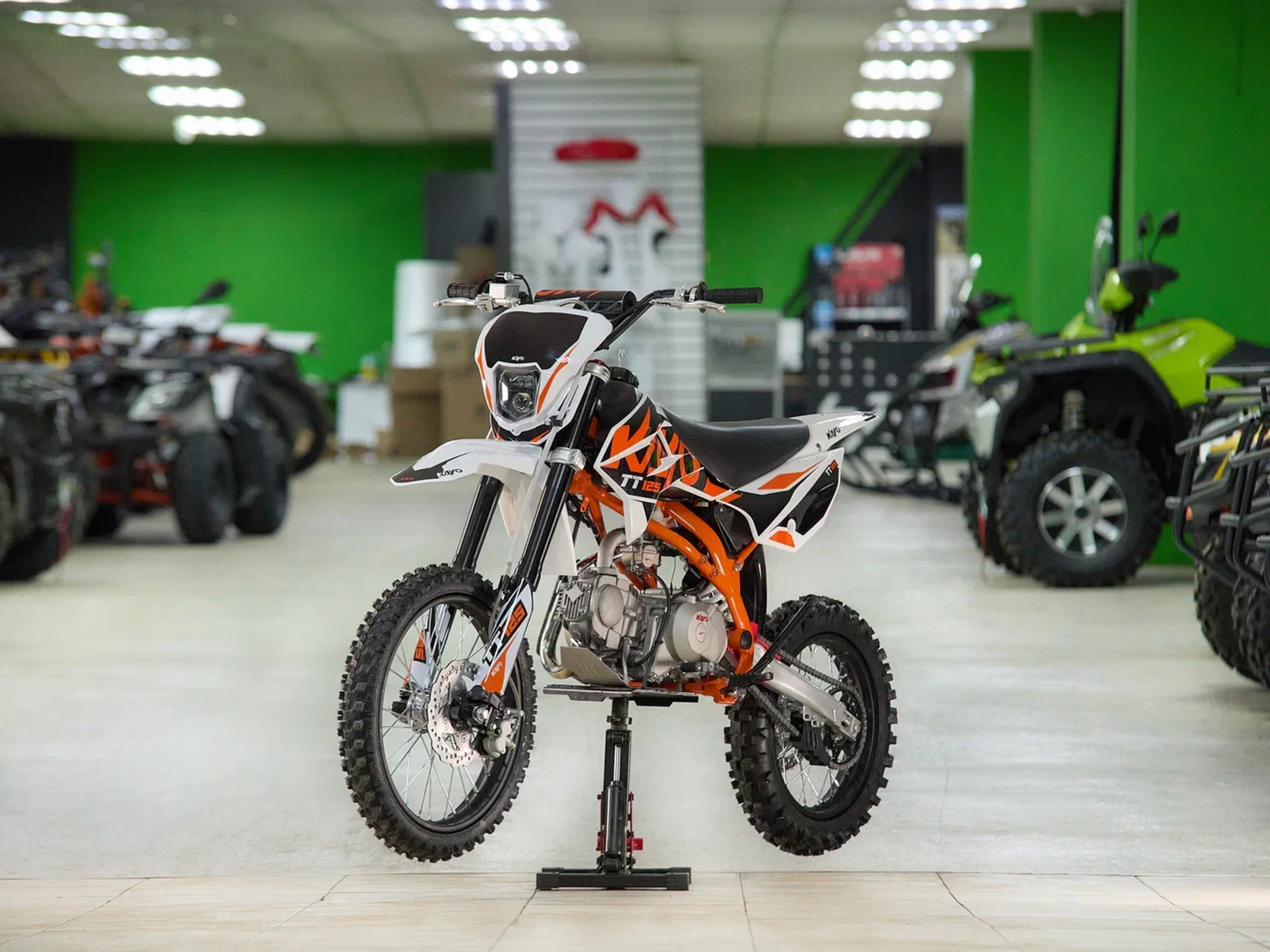 Питбайк KAYO Basic K125EM KRZ – идеальный снаряд для наработки первого опыта в мотокроссе и эндуро, который можно использовать на лёгких кроссовых трассах и дорогах с различным покрытием. Удобный, простой и надёжный мотоцикл, который полностью оправдывает свою цену.Одноцилиндровый 4-тактный двигатель воздушного охлаждения объёмом 125 см3, выдаёт 9 л.с. Карбюратор NIBBI PE19 обеспечивает бесперебойную работу техники в самых жёстких условиях эксплуатации, простоту и лёгкость в обслуживании, а также неприхотливость к качеству топлива. Питбайк оснащён механической 4-ступенчатой коробкой передач с формулой “N-1-2-3-4”.Мотоцикл имеет вес всего 72 кг. Усиленная рама из хром-молибденового сплава и подвеска позволяют эффективно амортизировать удары при езде по неровностям и препятствиям на трассе. Передняя подвеска — телескопическая вилка перевёрнутого типа длиной 770 мм, задняя — моноамортизатор длиной 360 мм. Оба компонента подвески являются нерегулируемыми. Рама и пластик являются собственной разработкой производителя. Мотоцикл оснащён классическими стальными спицованными колёсами диаметром 17 дюймов спереди и 14 дюймов сзади. Эффективное и безопасное замедление с любых скоростей обеспечивают гидравлические дисковые тормоза.Высококачественная износостойкая резина с развитым протектором отлично держит дорогу на различных типах покрытия. Байк оснащён как системой запуска двигателя при помощи кнопки электростартера, так и рычагом кик-стартера. Питбайк имеет вместительный топливный бак на 5,5 л, что гораздо больше, нежели у других байков этого класса.Питбайк оснащён стальной защитой картера и яркой светодиодной линзованной фарой.Если вы ищете послушный, компактный, шустрый и красивый питбайк, считайте, что вы его нашли. Это один из лучших мотоциклов для обучения и первых шагов в эндуро и мотокроссе. Он отлично подойдёт как для гонок на трассе, так и для покатушек по пересечённой местности.