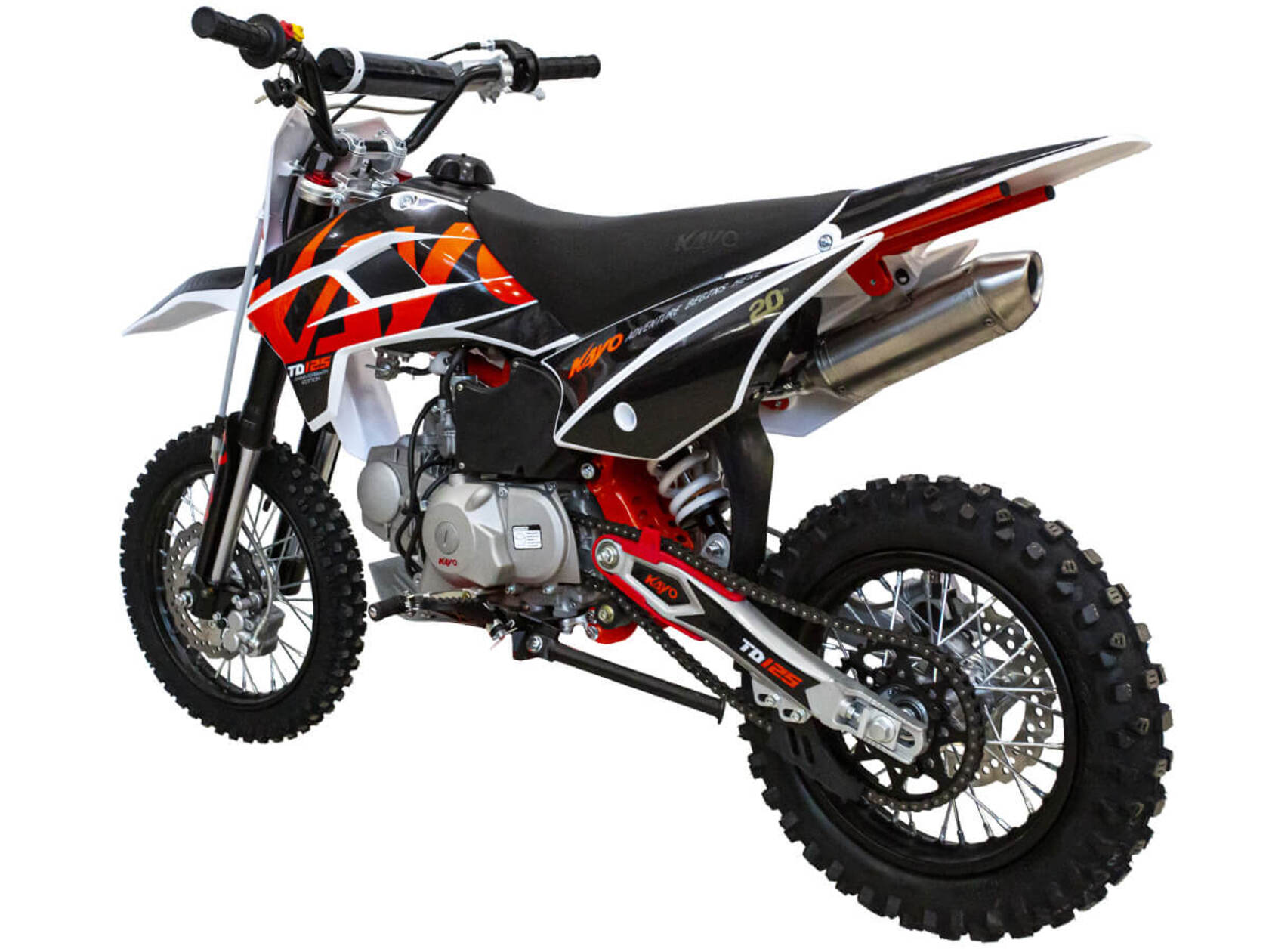 Питбайк KAYO Mini TD125 14/12 – подходящий вариант для смелых ребят от 8 лет. С ним можно научиться основам и контролю скорости на крутых спусках или сыпучих грунтах. Можно использовать и на лёгких кроссовых трассах, и на более сложных рельефах.Одноцилиндровый 4-тактный двигатель воздушного охлаждения ZONGSHEN ZS154FMI объёмом 124 см3, выдаёт 9 л.с. Карбюратор NIBBI PE19 обеспечивает бесперебойную работу техники в самых жёстких условиях эксплуатации, простоту и лёгкость в обслуживании, а также неприхотливость к качеству топлива. Питбайк оснащён полуавтоматической 4-ступенчатой коробкой передач с формулой “N-1-2-3-4”. Сцепление тут выжимать не нужно – переключение происходит под сброс газа, что позволит начинающим райдерам меньше отвлекаться и больше сосредоточиться на управлении питбайком.Аппарат имеет вес всего 65 кг и большой клиренс – 265 мм. Усиленная рама из хром-молибденового сплава и подвеска позволяют эффективно амортизировать удары при езде по неровностям и препятствиям на трассе. Передняя подвеска — телескопическая вилка перевёрнутого типа длиной 660 мм, задняя — моноамортизатор длиной 310 мм. Рама и пластик являются собственной разработкой производителя. Мотоцикл оснащён классическими стальными спицованными колёсами диаметром 14 дюймов спереди и 12 дюймов сзади. Эффективное и безопасное замедление с любых скоростей обеспечивают гидравлические дисковые тормоза марки HSK.Высококачественная износостойкая резина с развитым протектором отлично держит дорогу на различных типах покрытия. Байк оснащён системой запуска двигателя при помощи кнопки электростартера или при помощи рычага кик-стартера. Питбайк имеет вместительный топливный бак на 5,5 л, что гораздо больше, нежели у других байков этого класса.Если вы ищете послушный, компактный, шустрый, красивый питбайк для своего малыша, считайте, что вы его нашли. Это один из лучших мотоциклов для обучения и первых шагов в эндуро и мотокроссе. Он отлично подойдёт как для гонок на трассе, так и для покатушек по пересечённой местности.