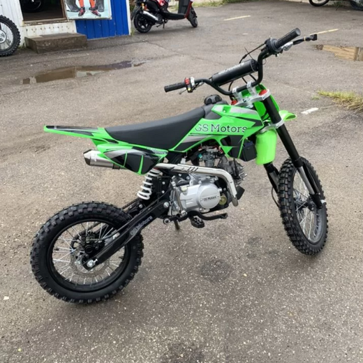 Питбайк GS Motors S12 17/14 идеален для поездок по грунтовым дорогам и бездорожью. Хорошо чувствует себя на мягком и среднем грунте. Питбайк прост в управлении и не требует специального ухода, подойдёт как новичкам, так и любителям мотокросса.Конструкция подчёркивает неуступчивый спортивный характер, который не остановится ни перед одним препятствием. Пластик комбинированный, прочный, не ломается при сгибании.Передняя подвеска — телескопическая нерегулируемая вилка перевёрнутого типа, которая отлично подходит для преодоления ям, ухабов и других неровностей плохих дорог или их отсутствия. Задняя подвеска маятниковая с моноамортизатором. Руль 22 мм с высоким подъёмом и перекладиной удобен для мотоциклистов разного роста.Питбайк весит всего 75 кг, выдерживает вес до 90 кг. Оснащён CNC траверсами, рама полудуплексная стальная, мотоцепь качественная. Колёса спицованные, металлические. Размер заднего колеса — 14 дюймов, переднего — 17 дюйм. Тормоза дисковые, передний тормозной суппорт двухпоршневой, задний — однопоршневой.Питбайк оснащён карбюратором JINGKI и одноцилиндровым четырёхтактным двигателем с воздушным охлаждением. Надёжный мотор 1P54FMI мощностью 8 л. с. и объемом 125 см³ разгоняет питбайк до 90 км/ч. Коробка передач механическая, четырёхступенчатая. Система зажигания электронная (CDI). Запуска двигателя - кикстартер.Покрышки с шипами и высоким грунтозацепом идеальны для бездорожья. Мощность мотора и небольшой вес питбайка позволяют ему преодолевать значительные препятствия и непролазную грязь, хорошо заходить в подъёмы.Питбайк относится к недорогим моделям, которые при должной эксплуатации работают без сбоев. Неприхотлив в обслуживании, не занимает много места в гараже. При необходимости в нём легко сменить любую повреждённую деталь.