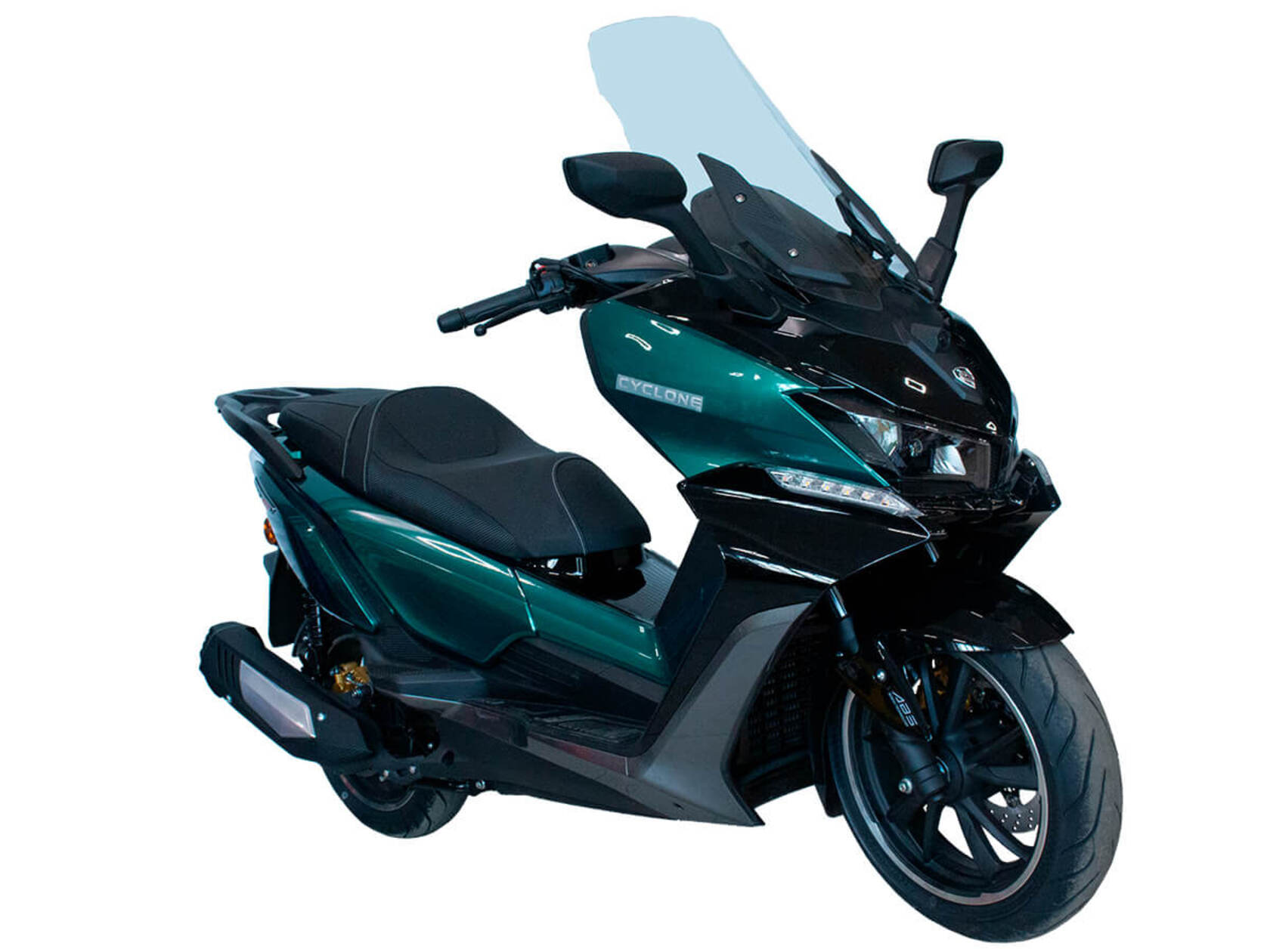 CYCLONE RT3S (SR300T) – городской максискутер, сочетающий в себе мощный двигатель, богатую компоновку и изысканный современный дизайн.Силовая установка представляет собой одноцилиндровый четырёхтактный двигатель объёмом 289 см3 имеет мощность 25 л.с. при 7500 об/мин. Максимальный крутящий момент достигается на 6000 об/мин и составляет 26,5 Н·м. Эти показатели позволяют RT3S по скоростным характеристикам конкурировать не только со скутерами, но и со среднекубатурными мотоциклами.Инжекторный впрыск топлива с блоком управления BOSCH увеличивает топливную экономичность, а также позволяет добиться высокой приёмистости и неприхотливости агрегата. Жидкостная система охлаждения не допустит перегрева двигателя даже при самом агрессивном вождении.На скутер установлен вариатор, который обеспечивает динамичную езду как в условиях городских пробок, так и на скоростных автострадах.Колёса скутера имеют литые диски диаметром 14 и 15 дюймов. Колёса обуты в бескамерные покрышки TIMSUN. Клиренс скутера составляет 155 мм. Подвеска представлена классической телескопической вилкой спереди и двумя газонаполненными амортизаторами сзади. Ход передней подвески составляет 129,5 мм, задней – 97,5 мм.Сухой вес скутера составляет 202 кг. Эффективное и безопасное замедление с любых скоростей обеспечивают гидравлические дисковые тормоза с ABS фирмы BOSCH спереди и сзади.Объём топливного бака этой модели – 17 литров.Модель имеет два видеорегистратора, электрорегулируемое ветровое стекло, подсветку пультов, возможность бесключевого доступа, датчики давления в шинах и USB-порт.Скутер сочетает в себе отличные технические характеристики, комфорт и надёжность, что позволяет вам ощутить настоящую свободу и всегда быть в ритме мегаполиса.